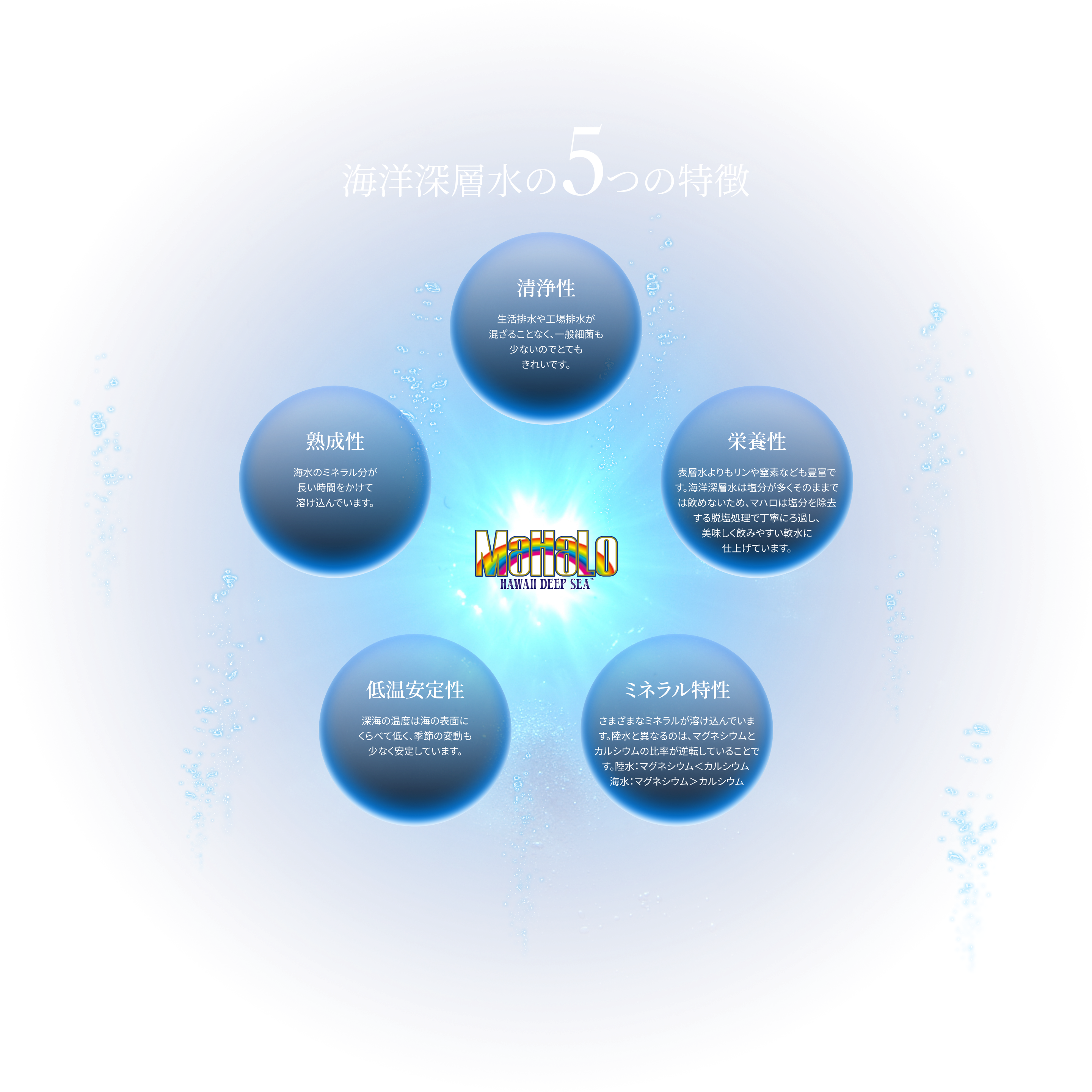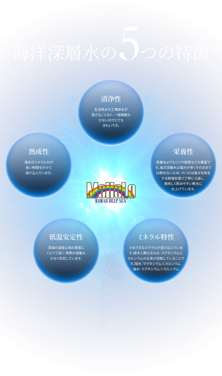 いつまでも若々しく元気でいたい方へ悠久の深海に育まれた海洋深層水を、塩分をろ過して飲みやすい軟水に仕上げたマハロ。いつまでも元気で若々しくいるための水分補給にお役立てください。